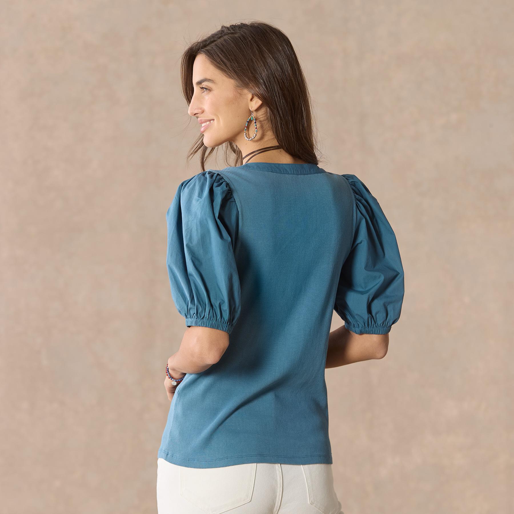 Our classic henley with a touch of feminine beauty featuring poplin sleeves and placket. laundry buttons and contract lace at the back neckline. Elastic cuffs. Cotton/spandex. Machine wash. Imported. Exclusive. Sizes XS (0–2). S (4–6). M (8–10). L (12–14). XL (16–18). XXL (20–22). Approx. 25l.