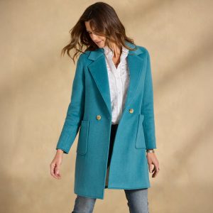 Stylish and bold. our stunning double breasted topper in menswear inspired pinstripes boasts two patch pockets and a contrast print lining. Polyester/wool. Dry clean. Imported. Exclusive. Sizes XS (0–2). S (4–6). M (8–10). L (12–14). XL (16–18). XXL (20–22). Approx. 36l.