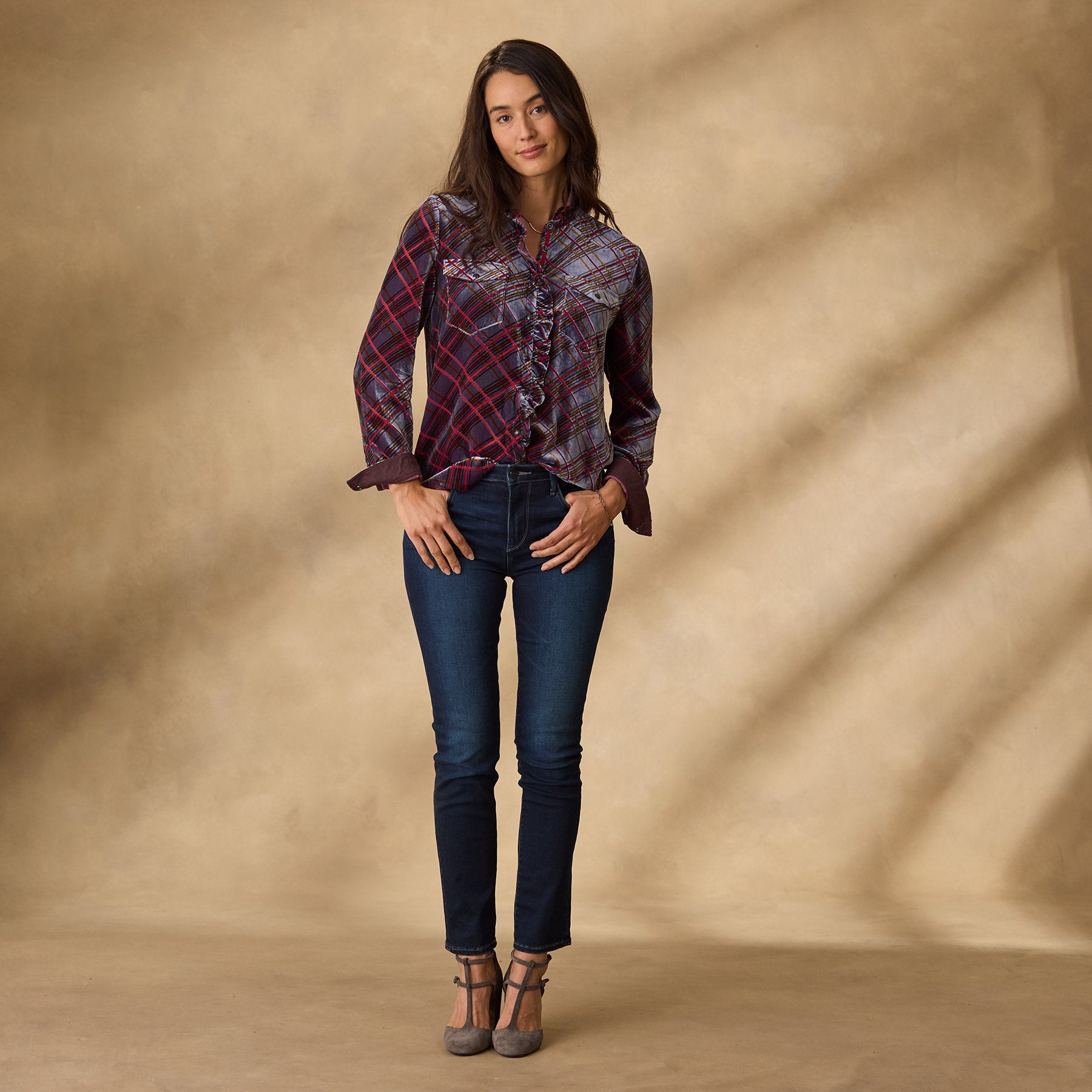 A Sundance favorite now in printed burnout velvet. this Western inspired. soft plaid shirt is beautiful with ruffles at the neckline for a feminine twist. Two patch pockets. snap closure and bandana print detail inside. Viscose/silk. Dry clean. Imported. Exclusive. Sizes XS (0–2). S (4–6). M (8–10). L (12–14). XL (16–18). XXL (20–22). Approx. 26l.