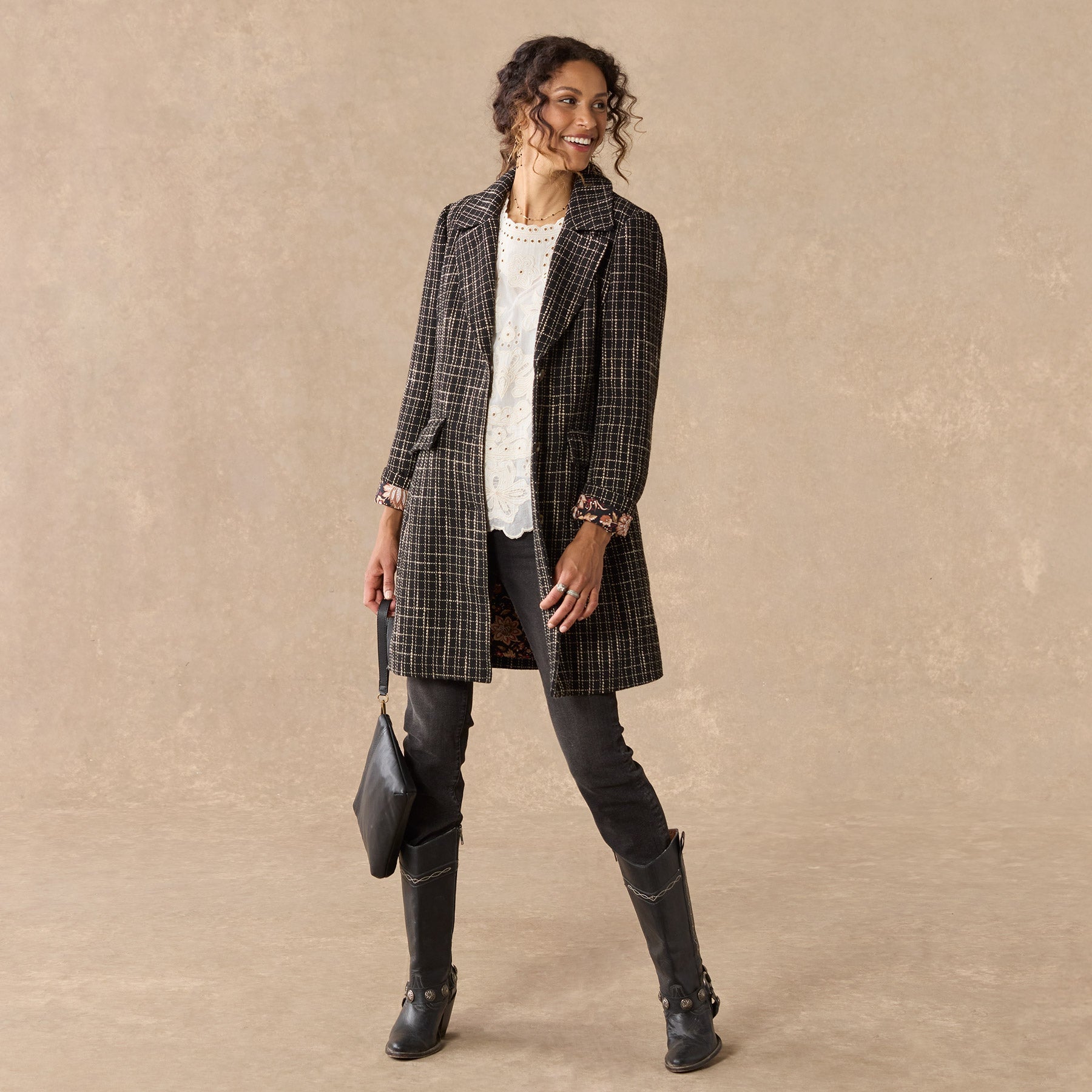 Our ladylike coat is slightly fitted. in a slubby plaid. with three-button closure. flap pockets and a standout floral lining. Soft and comfortable. midi-length. with a nice A-line shape. Wool/polyester. Dry clean. Imported. Exclusive. Sizes XXS (00). XS (0–2). S (4–6). M (8–10). L (12–14). XL (16–18). Approx. 35l.