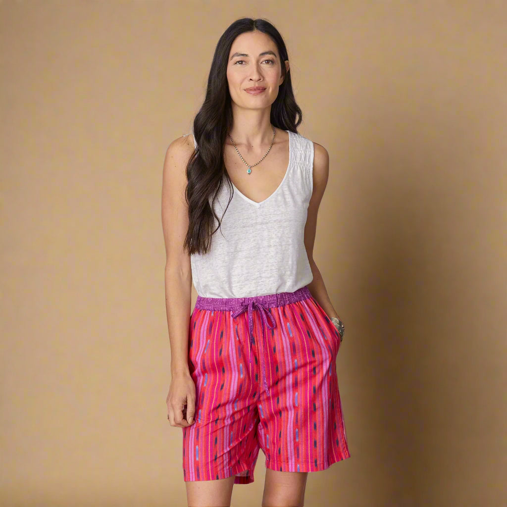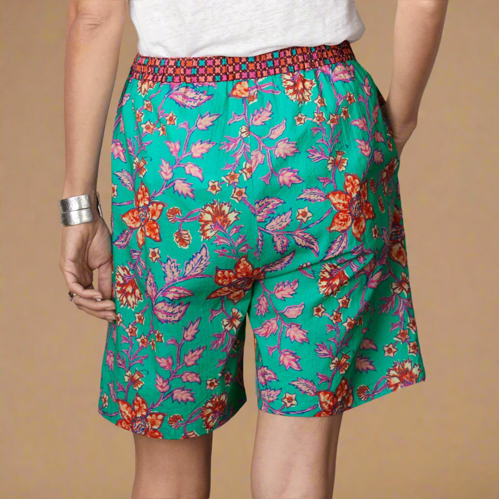 Vibrant prints add joy to our relaxed. high rise shorts with contrast print under the drawstring. Cotton. Machine wash. Imported. Exclusive. Sizes XXS (00). XS (0-2). S (4-6). M (8-10). L (12-14). XL (16-18). 6.25 inseam.