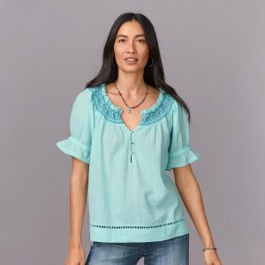 Feminine and full of surprising texture. our relaxed pullover top with contrast smocking. ruffles and scalloped neckline flows with pretty lace details. Button placket with loops. elastic cuffs. Cotton. Machine wash. Imported. Exclusive. Sizes XXS (00). XS (0-2). S (4-6). M (8-10). L (12-14). XL (16-18). Approx. 22.5l.