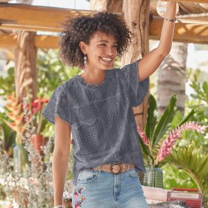 It doesn’t get more romantic than our vintage-inspired. eyelet and lace patchwork top with slight flutter sleeves and scalloped lace at neckline. Mixed media. with woven front and knit back. Cotton. Machine wash. Imported. Exclusive. Sizes XS (0-2). S (4-6). M (8-10). L (12-14). XL (16-18). XXL (20-22). Approx. 24l.