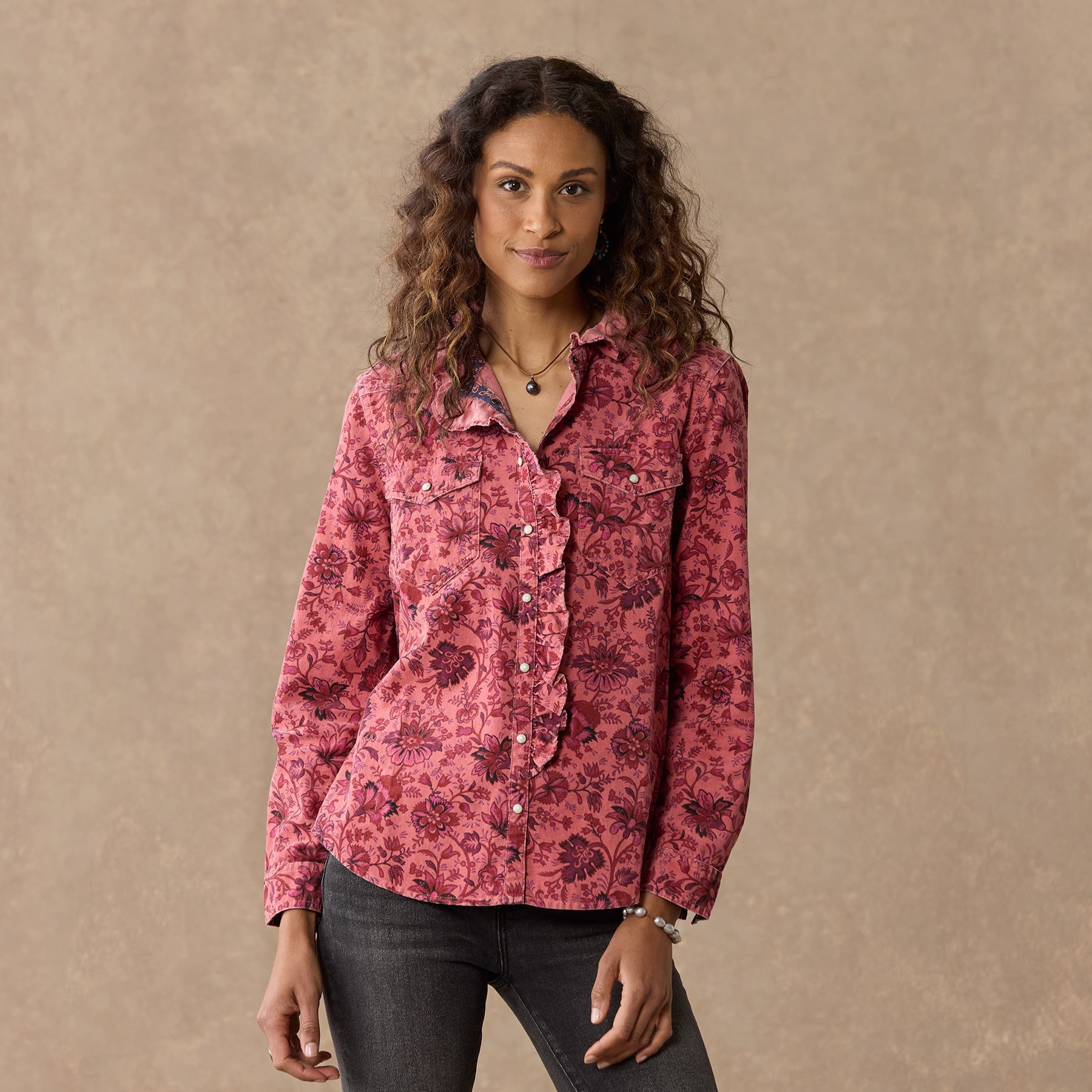 Floral printed and over-dyed. this Western inspired. soft corduroy shirt is beautiful with ruffles at the neckline for a feminine twist. Two patch pockets. snap closure and bandana print detail inside. Cotton. Machine wash. Imported. Exclusive. Sizes XS (0–2). S (4–6). M (8–10). L (12–14). XL (16–18). XXL (20–22). Approx. 26l.