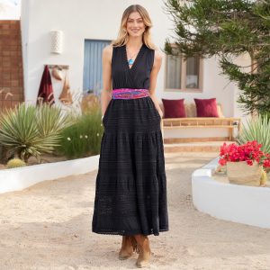 Our sleeveless maxi dress is adorned with beautiful crochet lace throughout. With pintucks on the skirt. a surplice neckline. a surplice back with ties. smocked waist and side seam pockets. Lined. Cotton. Machine wash. Imported. Exclusive. Sizes XXS (00). XS (0–2). S (4–6). M (8–10). L (12–14). XL (16–18). Approx. 50.75l.