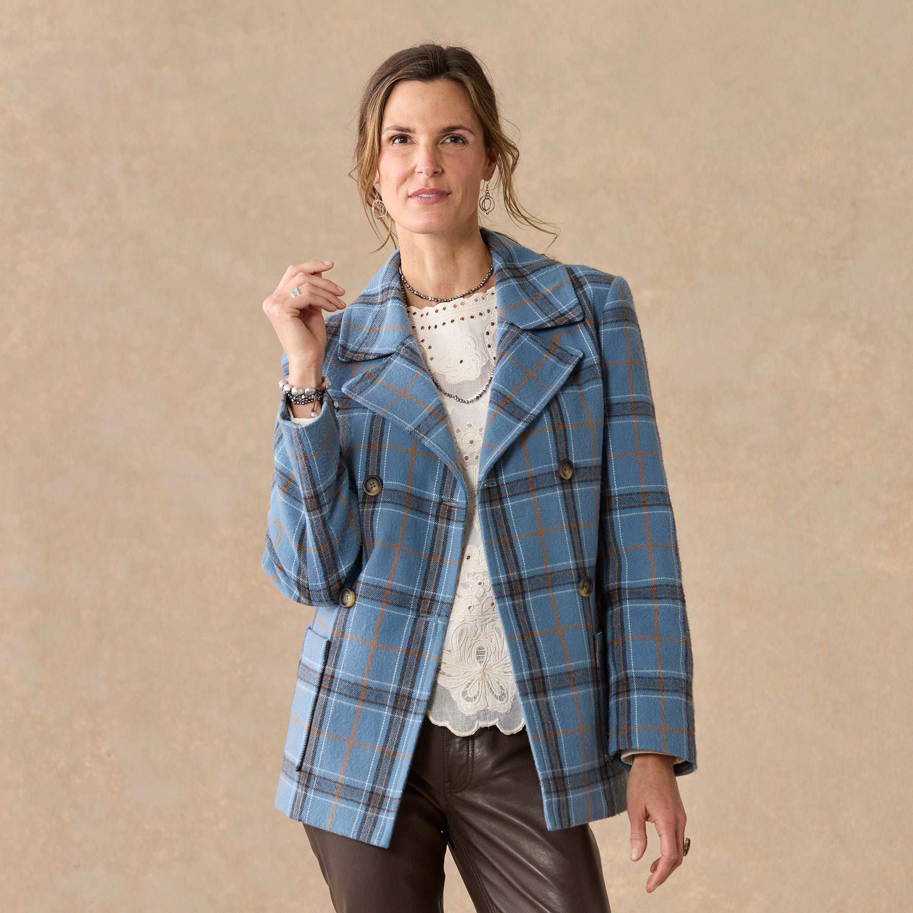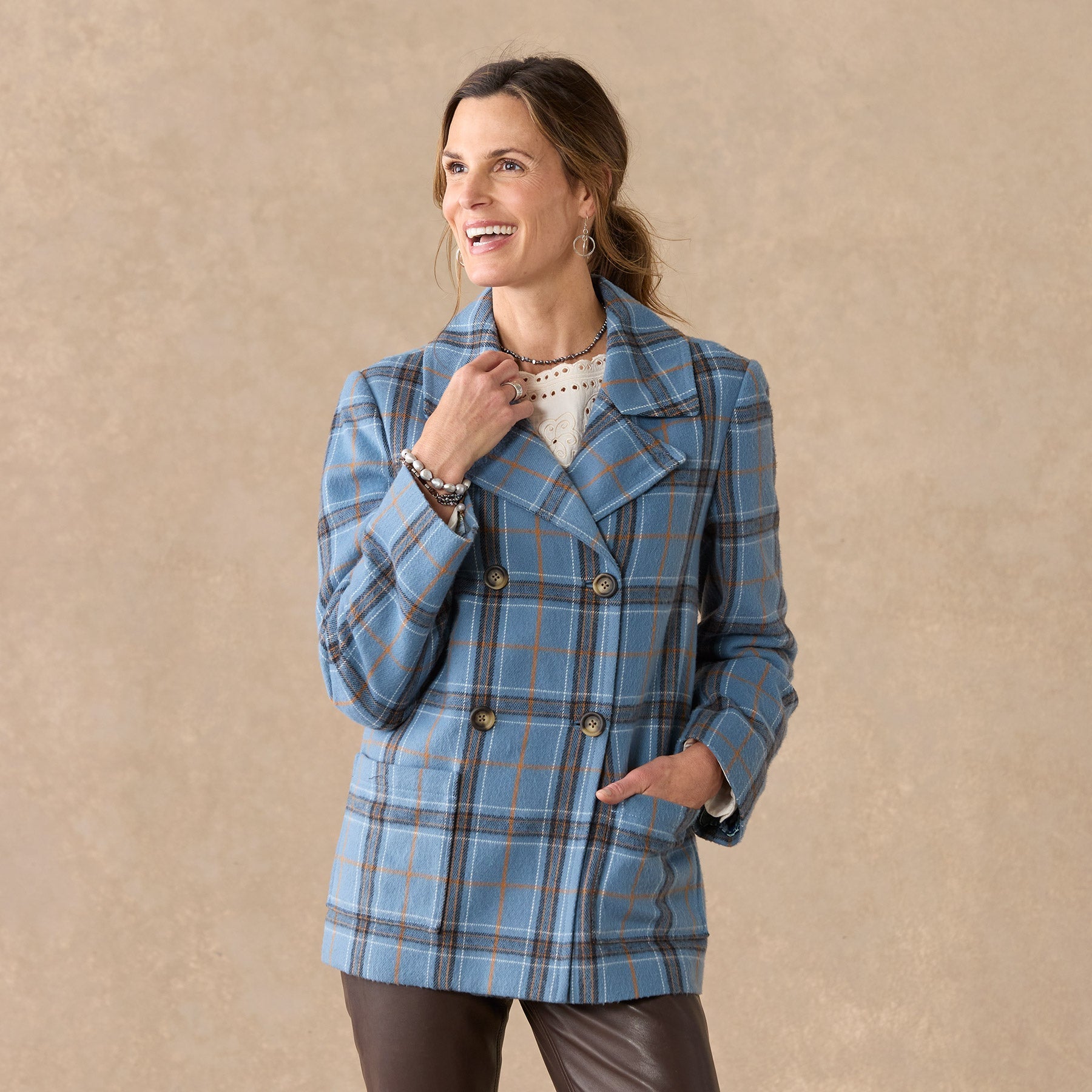 Our smart. brushed flannel plaid pea coat is soft. classic and beautiful. Double breasted. with faux horn buttons. patch pockets and a fun. floral-printed lining. Polyester. Dry clean. Imported. Exclusive. Sizes XS (0?C2). S (4?C6). M (8?C10). L (12?C14). XL (16?C18). XXL (20?C22). Approx. 29l.