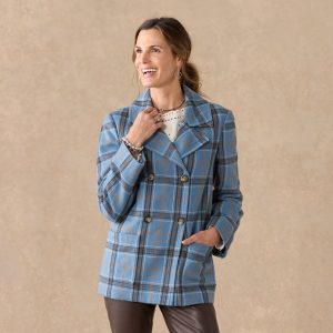 Our smart. brushed flannel plaid pea coat is soft. classic and beautiful. Double breasted. with faux horn buttons. patch pockets and a fun. floral-printed lining. Polyester. Dry clean. Imported. Exclusive. Sizes XXS (00). XS (0–2). S (4–6). M (8–10). L (12–14). XL (16–18). Approx. 27l.