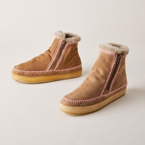 Queen of comfort and handcrafted style. these cozy. shearling boots are accented with hand-crocheted details. Imported. Euro whole sizes 36-42. 1 heel.