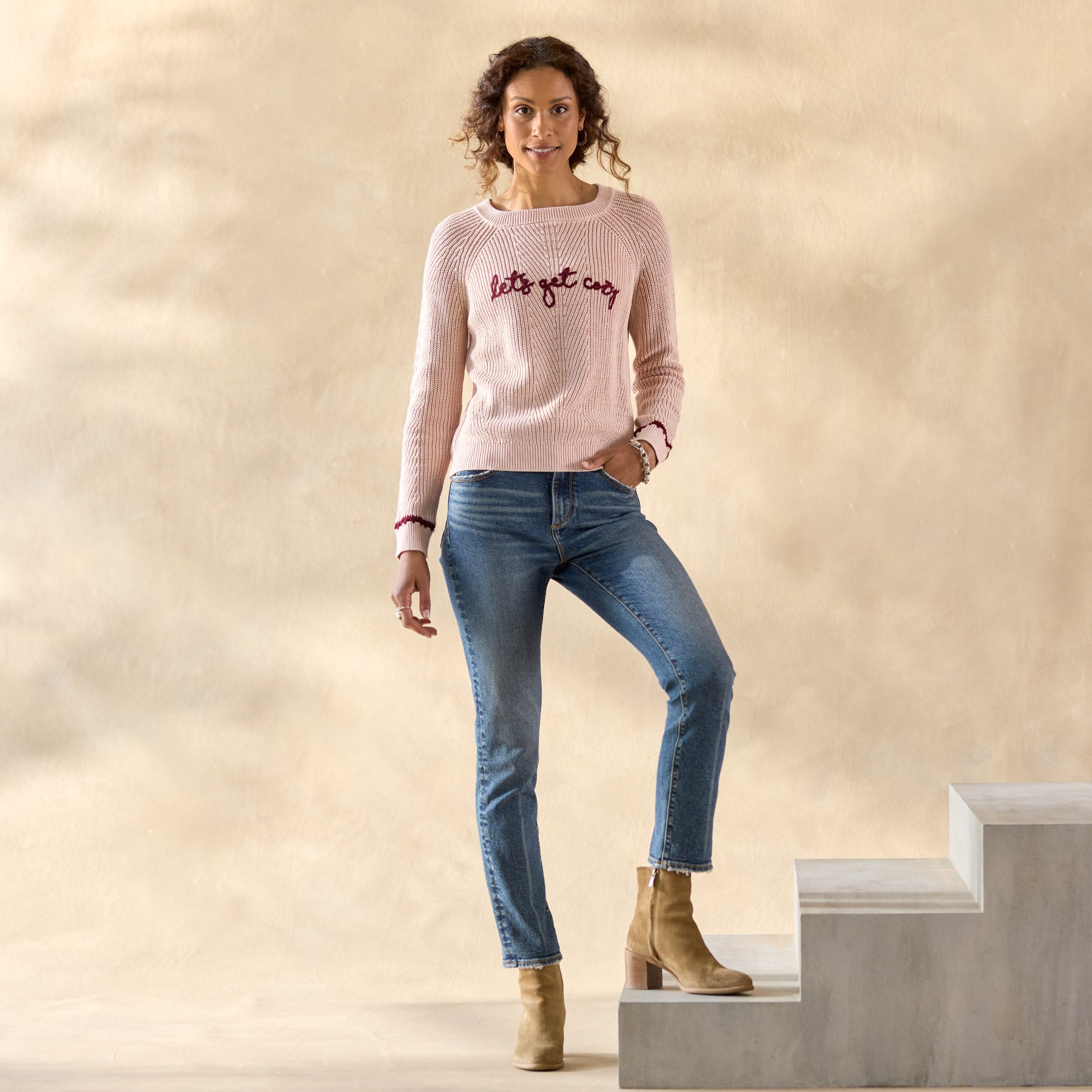 Our fabulously festive rib stitch sweater celebrates the winter season in textural beauty. with acid-washed color. hand-crocheted cuff details. embroidered sentiment. rib trim and crewneck. Simple and sassy. Combed cotton/nylon. Hand wash. Imported. Exclusive. Sizes XS (0?C2). S (4?C6). M (8?C10). L (12?C14). XL (16?C18). XXL (20?C22). Approx. 22.5l.