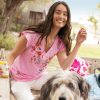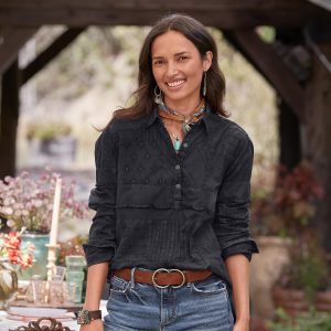 A delightful patchwork of textures embellish this intriguing shirt. a creative mix of dot. pintuck. ruffle and embroidery details. Cotton. Machine wash. Imported. Sizes XS (4). S (6). M (8-10). L (12). XL (14). Approx. 26.75l.