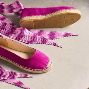 These true espadrilles feature a removable pleated scarf that functions as an ankle tie. Leather-lined. cushioned insole. Suede. Spain. Exclusive. Whole sizes 36-41. 36 (US 5.5). 37 (US 6). 38 (US 7). 39 (US 8). 40 (US 8.5). 41 (US 9.5).